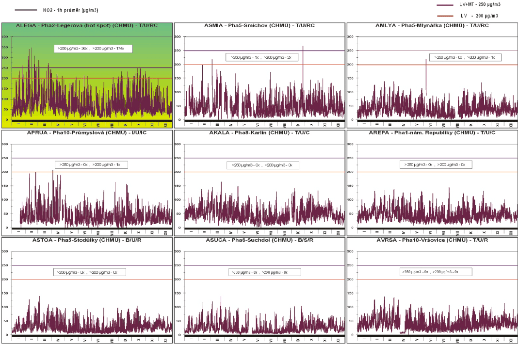 Překročení hodinového imisního limitu včetně meze tolerance (250 µg.m-3) bylo zaznamenáno pouze na dopravně orientované stanici Praha 2 - Legerova (hot spot). Tato stanice vykazuje za rok 2005 velmi vysoký počet překročení imisního limitu hodinové koncentrace oxidu dusičitého – 174x, s mezí tolerance 36x, což přesahuje tolerovaný počet překročení za rok. Výsledky měření této stanice dokládají velký problém hlavního města Prahy s dopravou vedenou středem města.