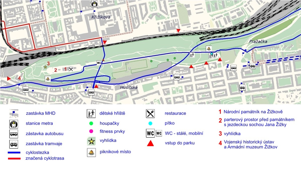 1 Památník národního osvobození, 2 parterový prostor před památníkem s jezdeckou sochou Jana Žišky, 3 vyhlídka, 4 Vojenský historický ústav + Armádní muzeum Žižkov, vstupy do parku
