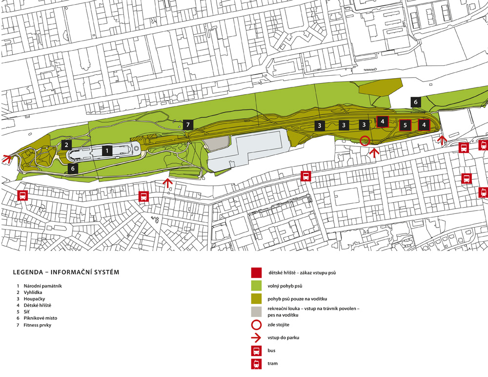Nejužívanější vstupy do parku, spojení MHD:
