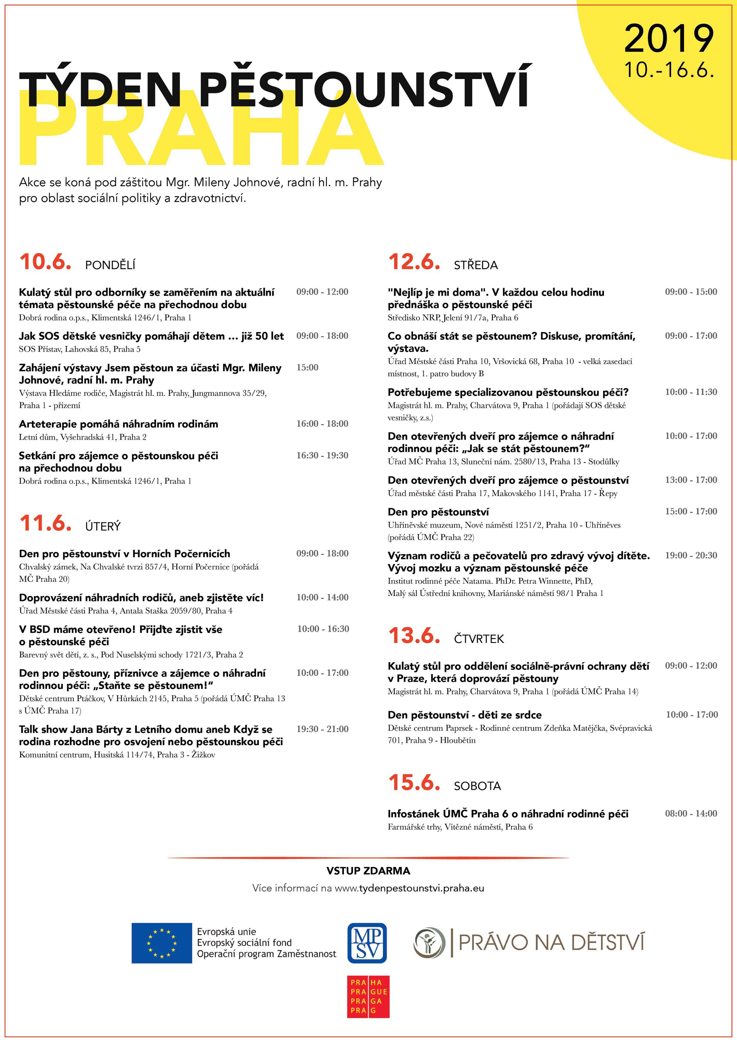 První ročník Týdne pěstounství se uskuteční v Hlavním městě Praze od 10. do 16. června 2019. Jde o akci pořádanou v krajích České republiky v rámci projektu Systémová podpora nástrojů sociálně-právní ochrany dětí.