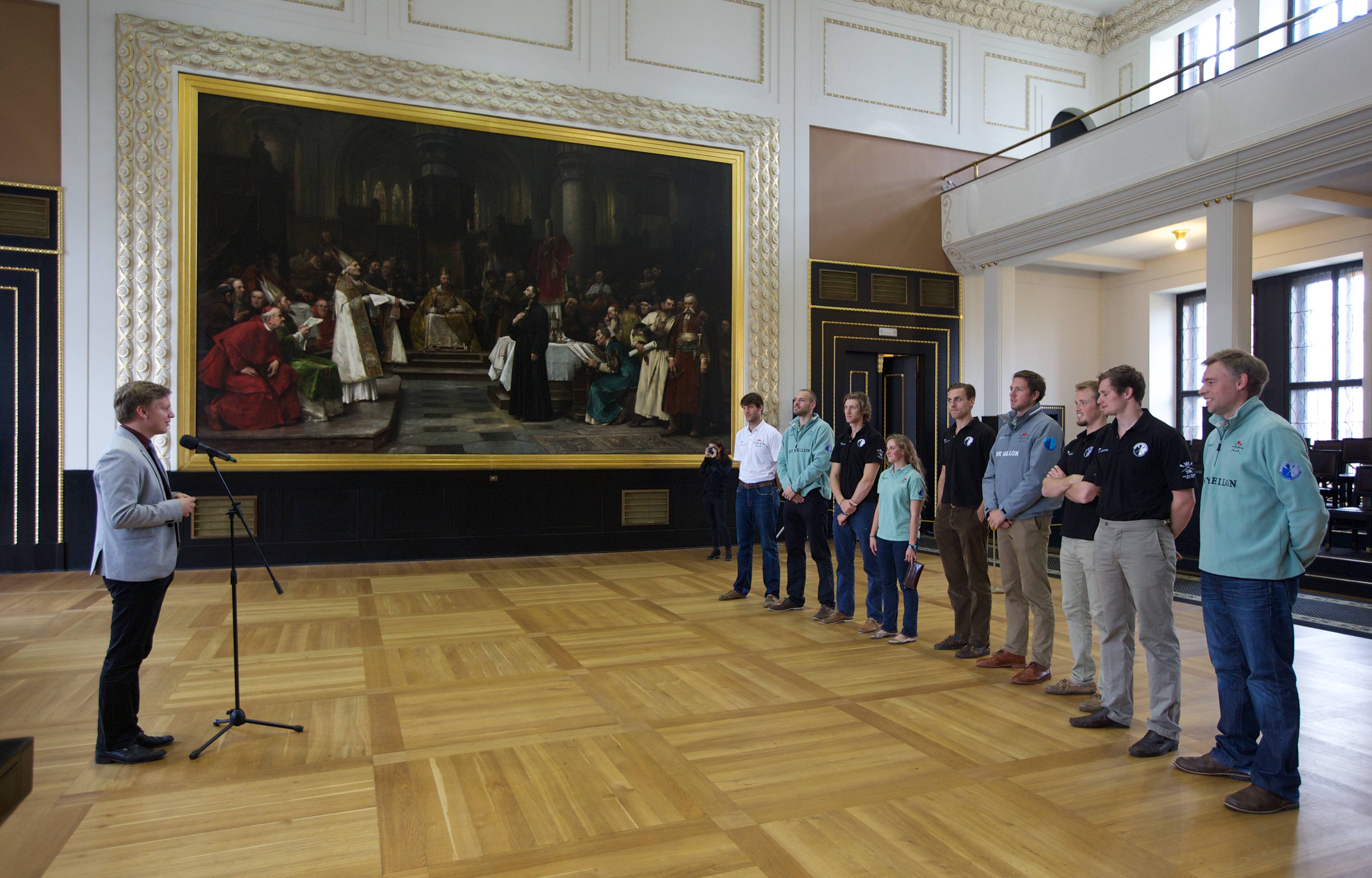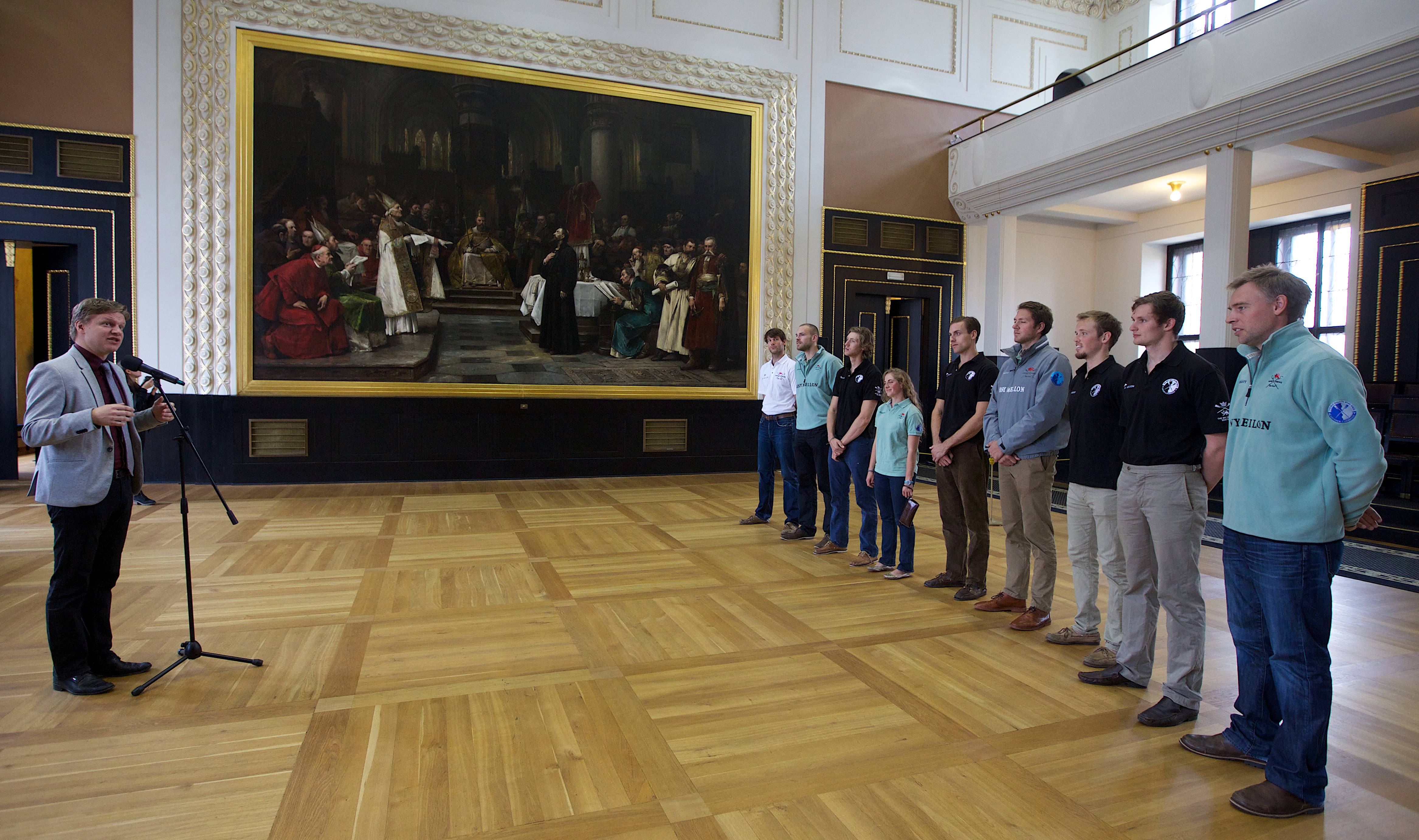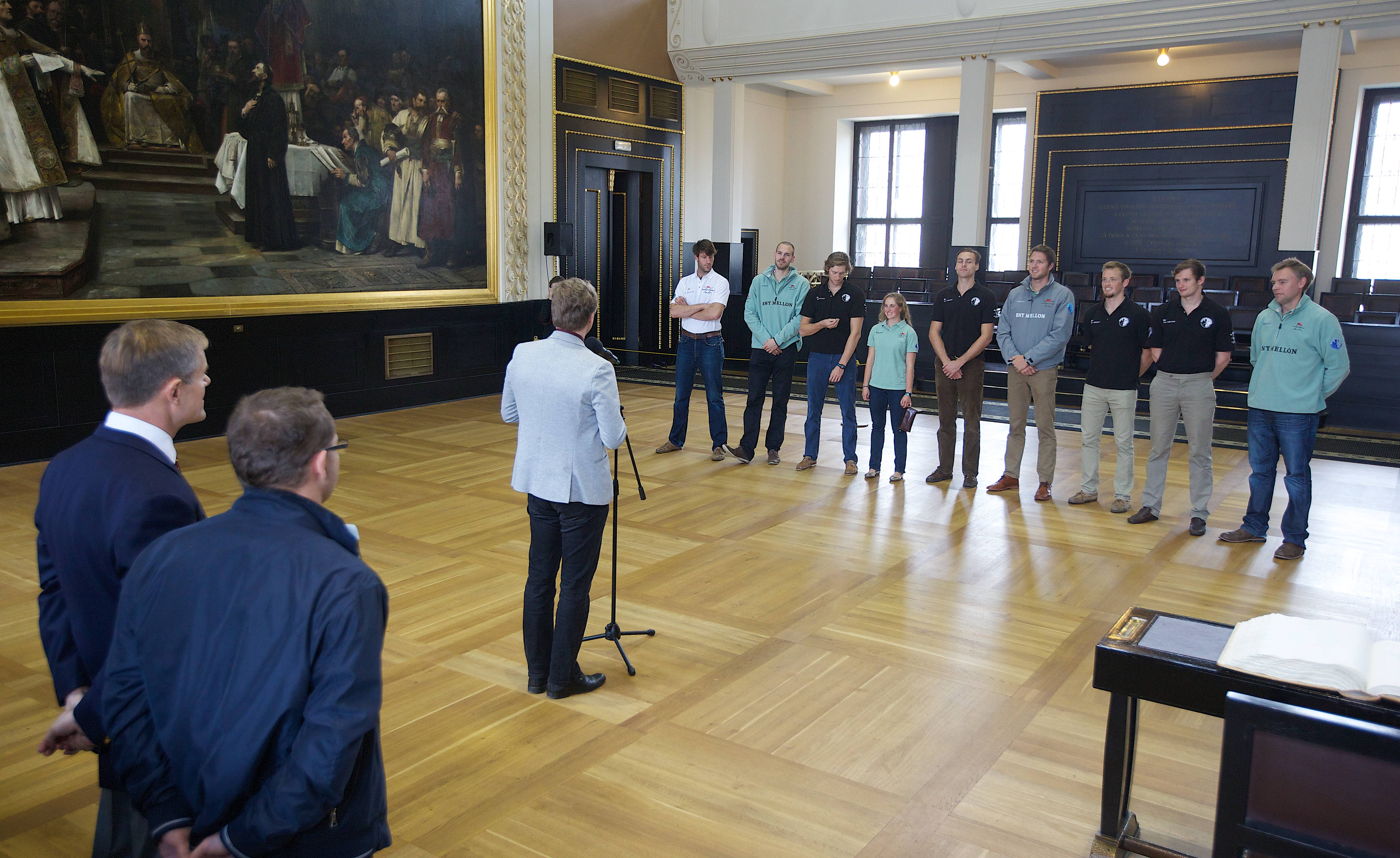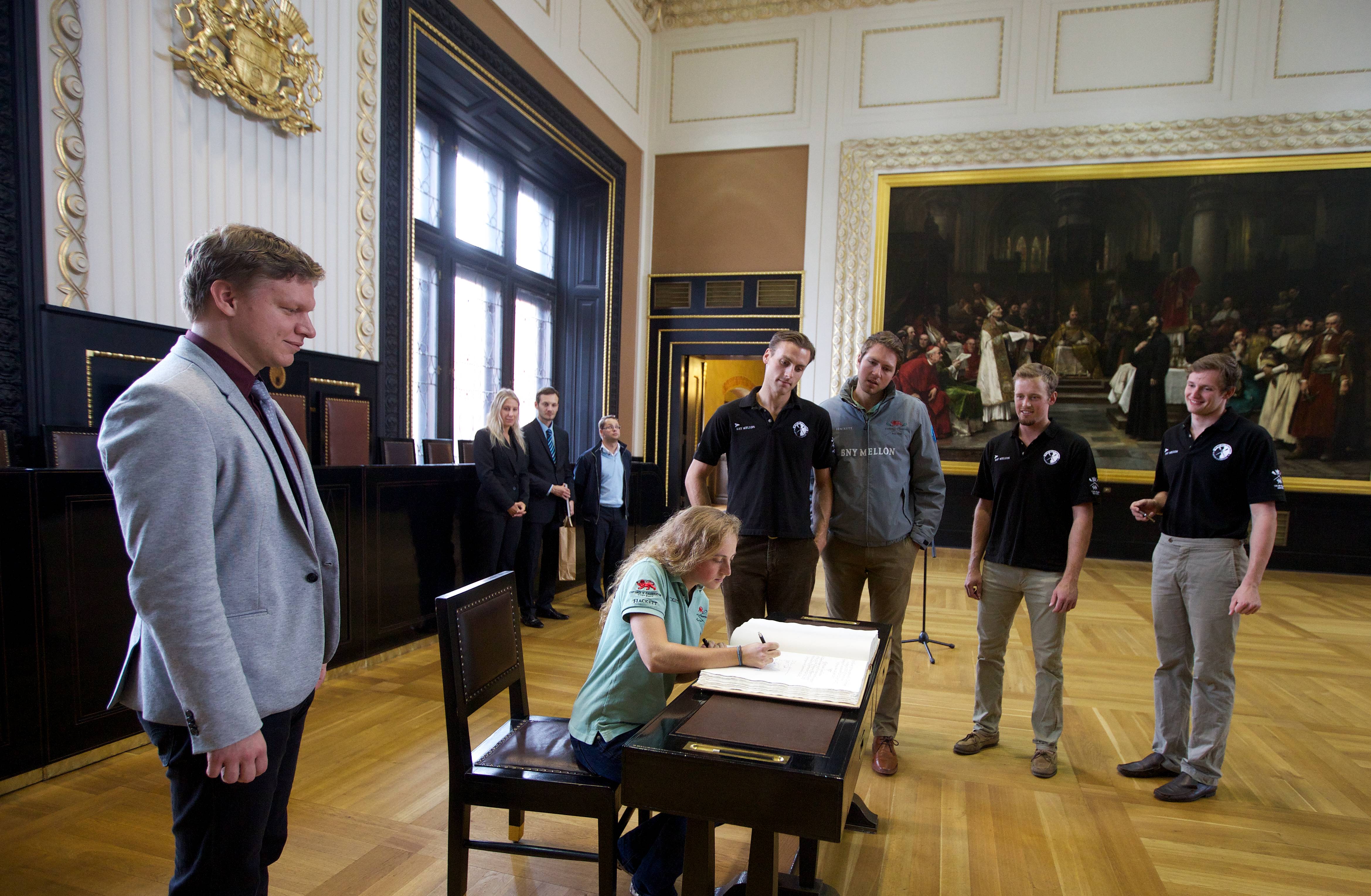 U příležitosti konání 100. ročníku Primátorek dnes primátor hl. m. Prahy Tomáš Hudeček přijal posádku osmiveslice a další hosty z Cambridge na Staroměstské radnici.